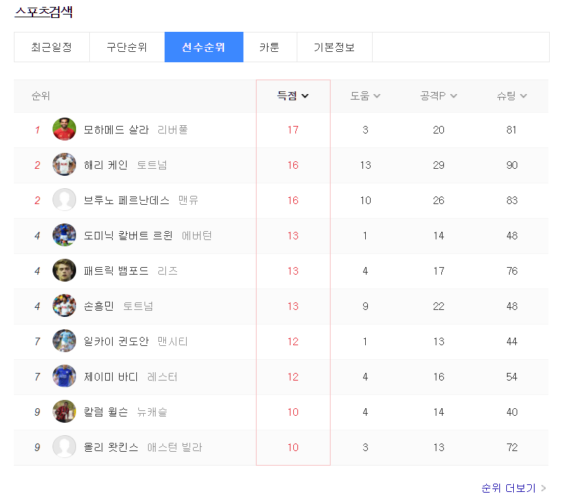 다음은 선수 순위입니다.